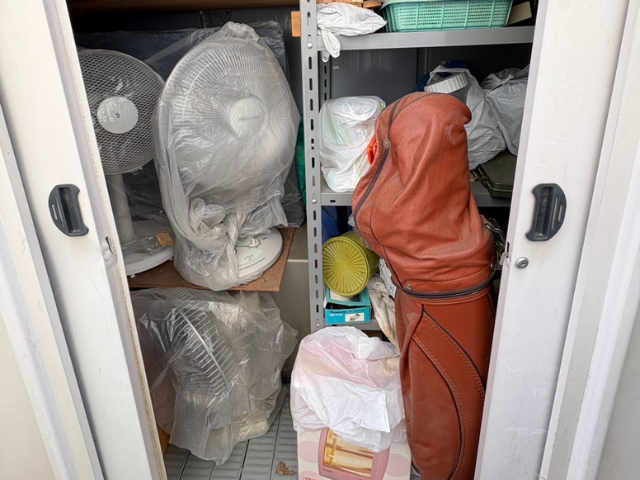 1棟目の倉庫にはペット用品やベビーカー、フラフープ、衣類などの使わなくなった生活用品が多数ありました。2棟目にはゴルフクラブや扇風機、工具、プラスチック容器など、趣味に使っていたと思われる品でぎっしりでした。