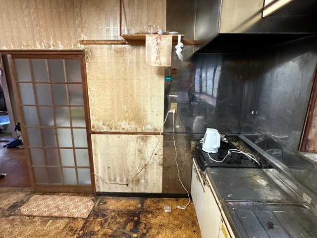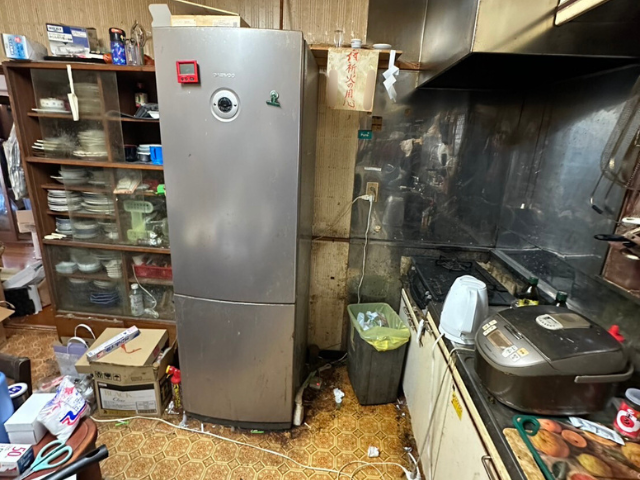 急な入院で片付けの時間が取れず、生活の跡が残ったままのキッチンには、家電や家具が残り、テーブルの上には食品・お鍋・調味料が散乱。キッチン全体に空き容器や空き瓶、ダンボールが散らかった状態でした。